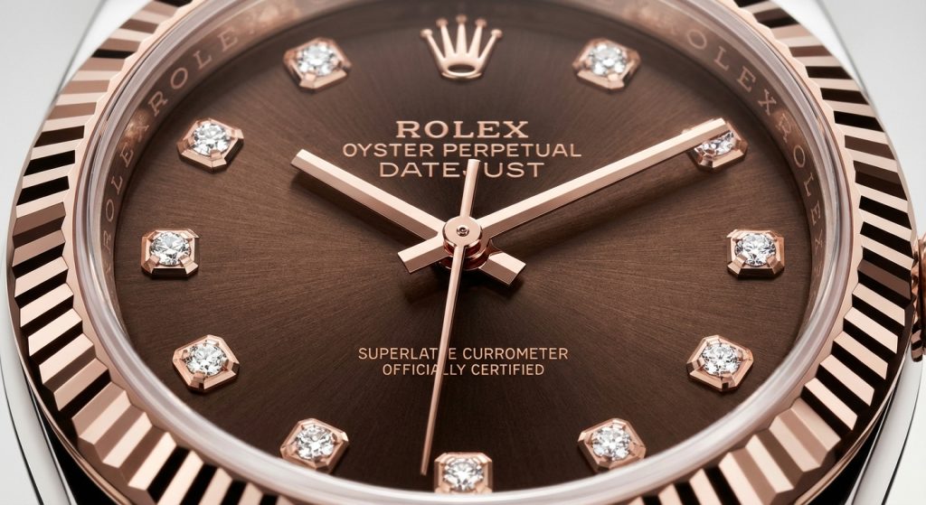 Tuyệt tác trang sức trên cổ tay. Phiên bản vàng hồng Everose độc quyền của Rolex kết hợp cùng mặt số Chocolate nạm kim cương tạo nên vẻ đẹp quyến rũ và quyền quý.